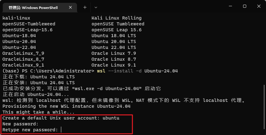 安装过程中会提示创建 Linux 用户名和密码(非 Windows 密码)。