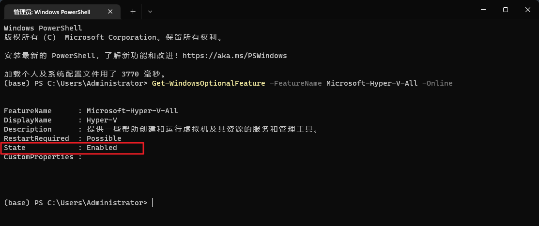 Get-WindowsOptionalFeature -Online -FeatureName Microsoft-Hyper-V-All若返回 State: Enabled,表示成功。