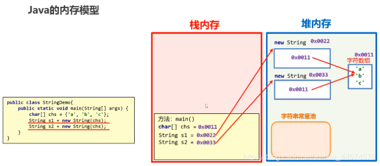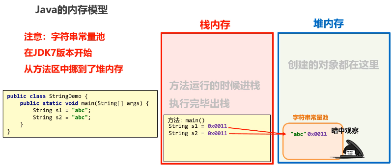 变量 s 指向的是堆中的新对象,而非常量池中的对象。