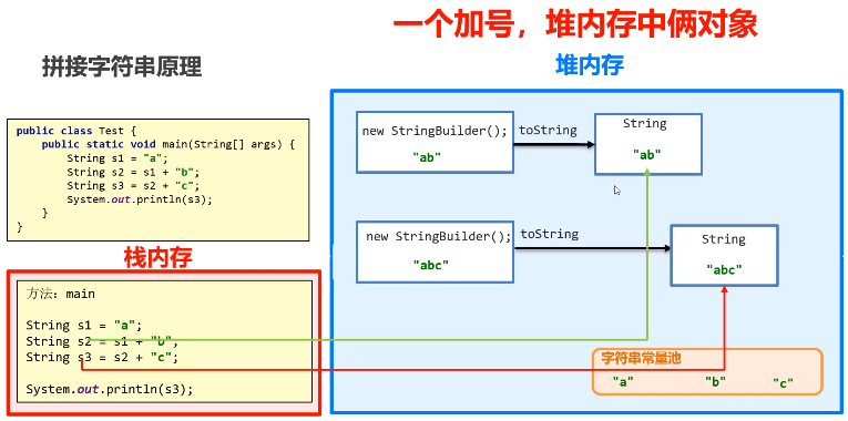 就是使用 StringBuilder 进行拼接,底层其实是在堆内存中创建了一个 StringBuilder 对象进行实现的, 只要出现了一个 + 号至少会在堆内存中创建一个 StringBuilder 对象