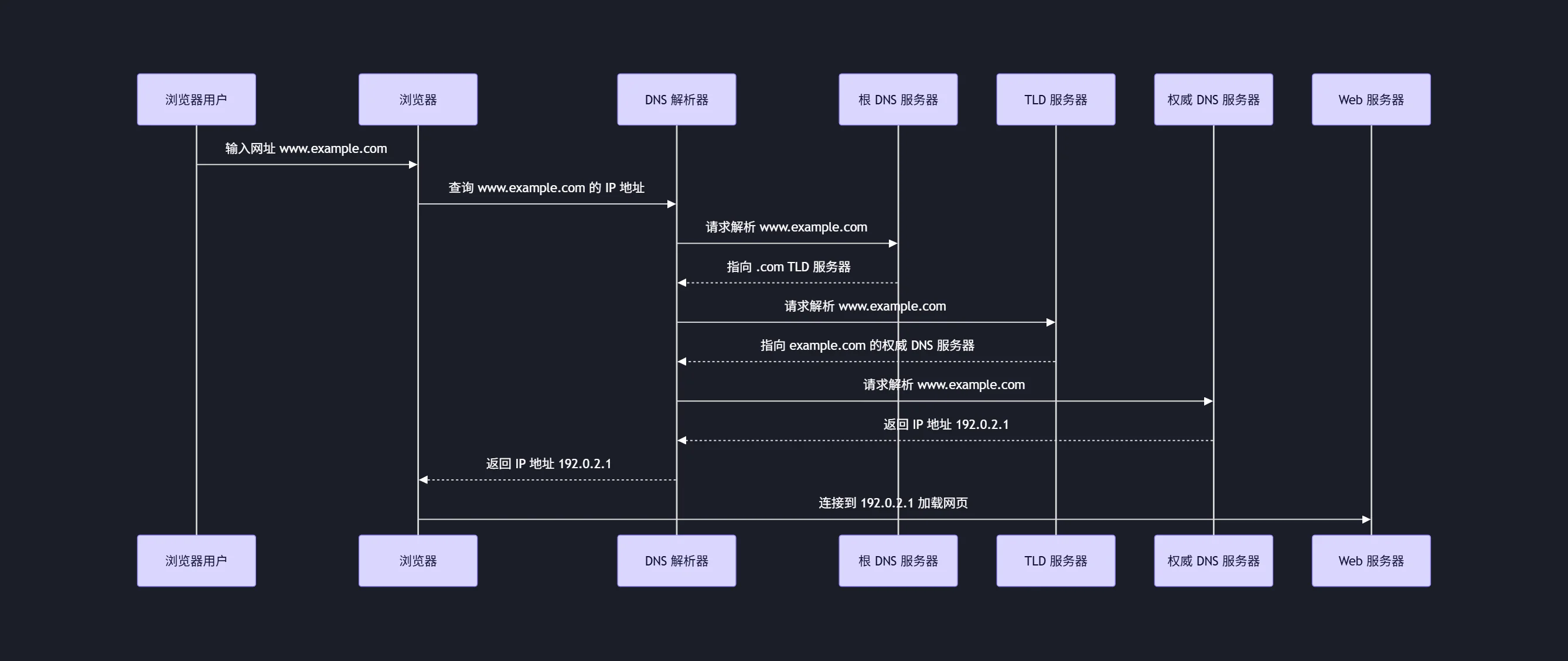 DNS(Domain Name System,域名系统)是一种用于将 域名 转换为 IP 地址 的分层、分布式命名系统。当你在浏览器中输入一个网址(如 www.example.com),DNS 会解析该域名并将其转换为对应的 IP 地址,以便浏览器能够访问正确的服务器。