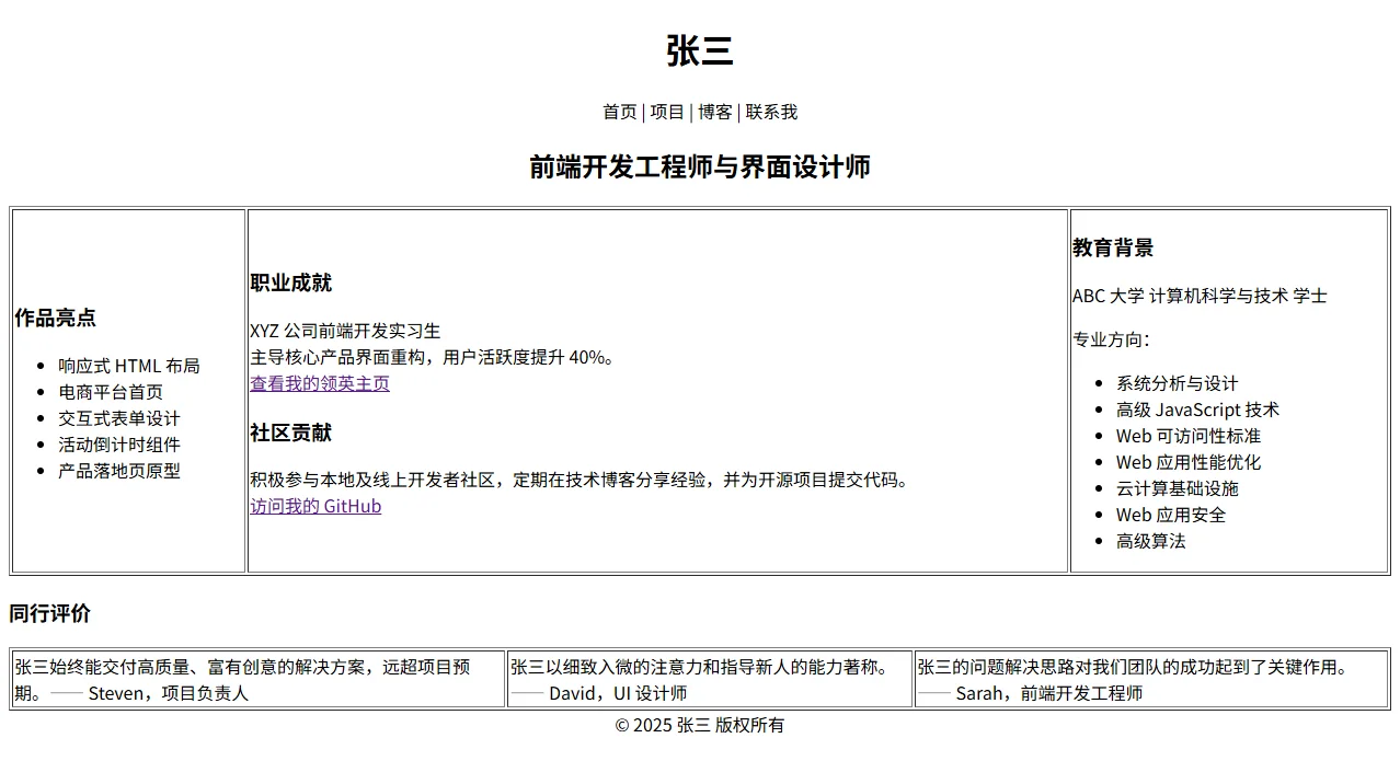 <footer style="text-align:center;">© 2025 张三 版权所有</footer>使用 <footer> 语义化标签,保持风格统一。
