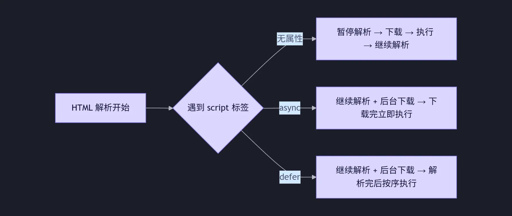 默认情况下,HTML 解析遇到 <script> 会暂停,直到脚本下载并执行完毕。这可能阻塞页面渲染。为优化性能,可使用以下两个属性: