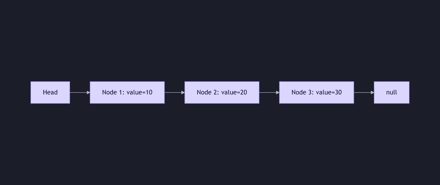 链表从头节点(head) 开始,通过 next 指针依次连接,形成一条“链条”。