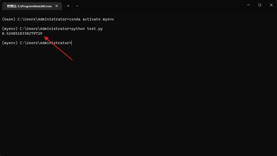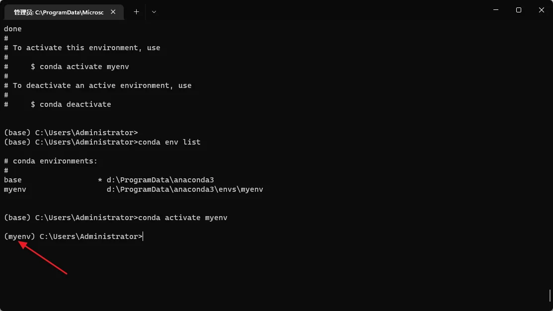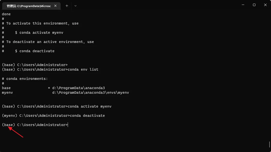 完场上述步骤之后,需要再检查下 conda 是否能够正常使用