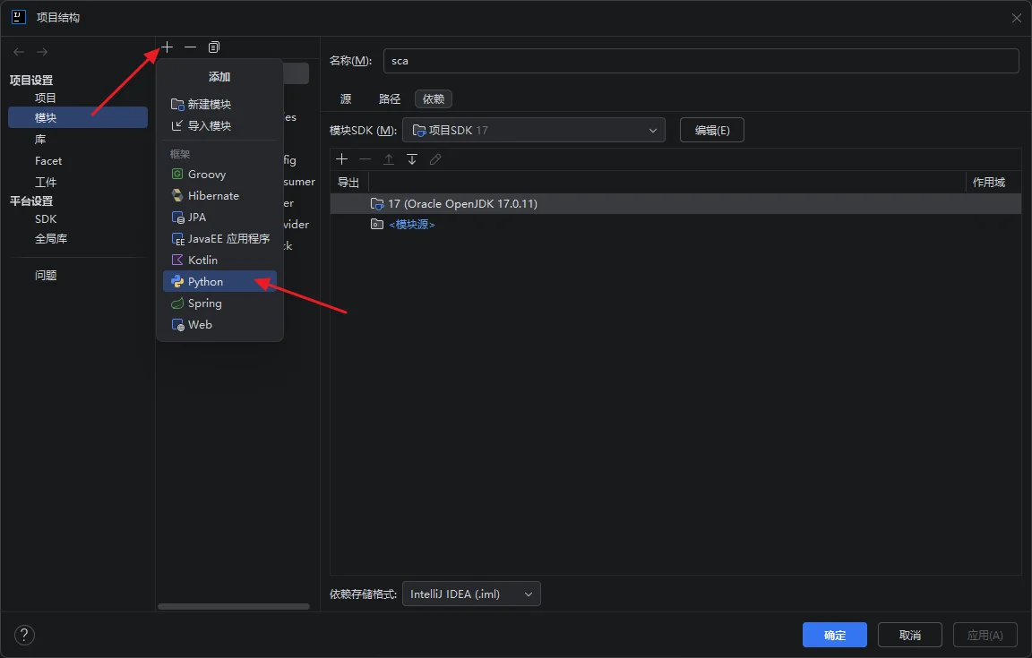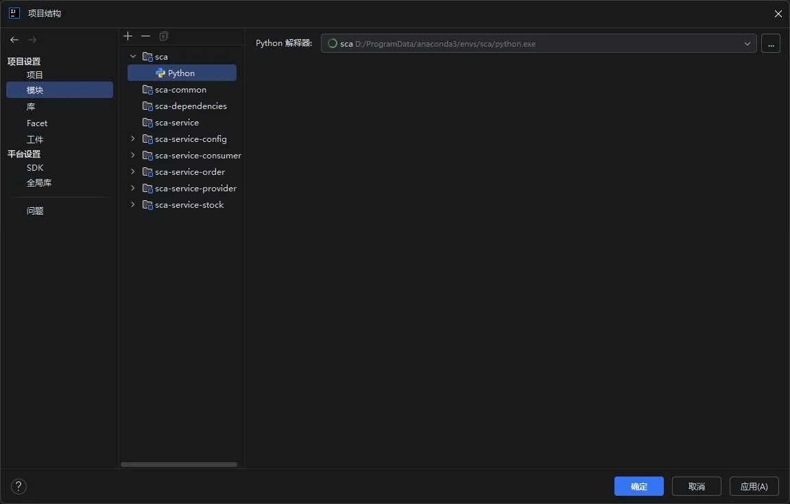 在【项目设置】-【模块】添加 Python 解释器