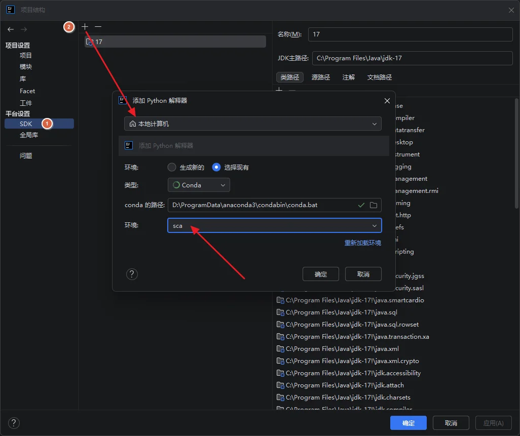 # 路径为:D:\ProgramData\anaconda3\condabin\conda.bat在【项目结构】-【平台设置】-【SDK】中添加本地 Python 解释器