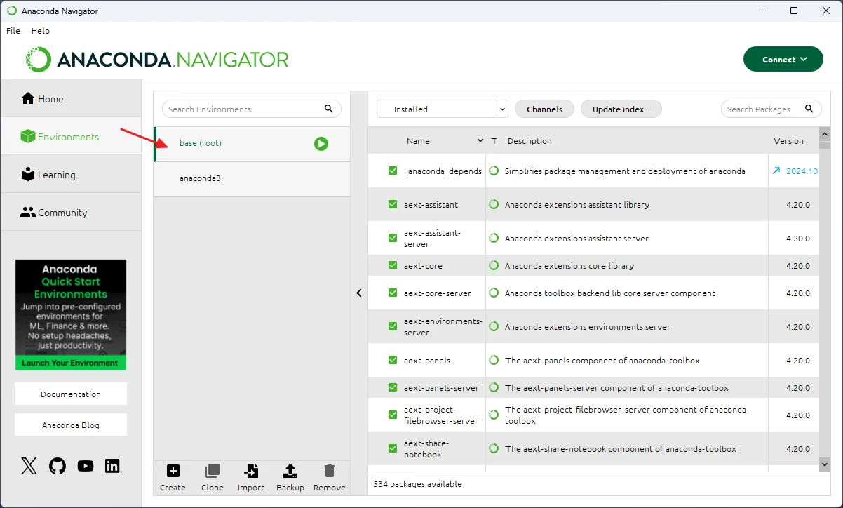 点击【Environments】可以看到我们正在【base】环境中