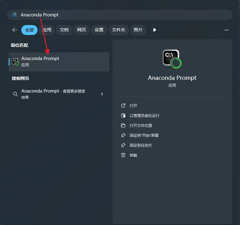 通过快捷键【Win + R】搜索找到 Anaconda Prompt,点击打开后,在控制台中输入 conda --version,回车如果返回了 conda 版本信息则说明安装成功
