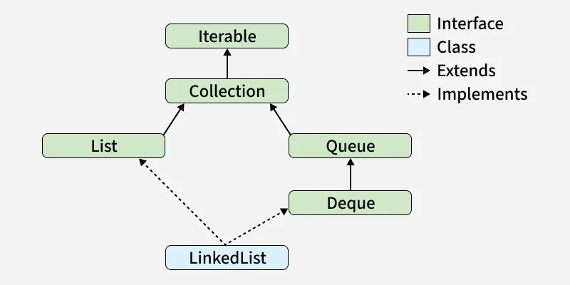 LinkedList 同时实现了 List 接口和 Deque 接口,而这两个接口都继承自 Collection 接口。这使得 LinkedList 既可以作为列表使用,也可以作为双端队列(甚至栈)使用。