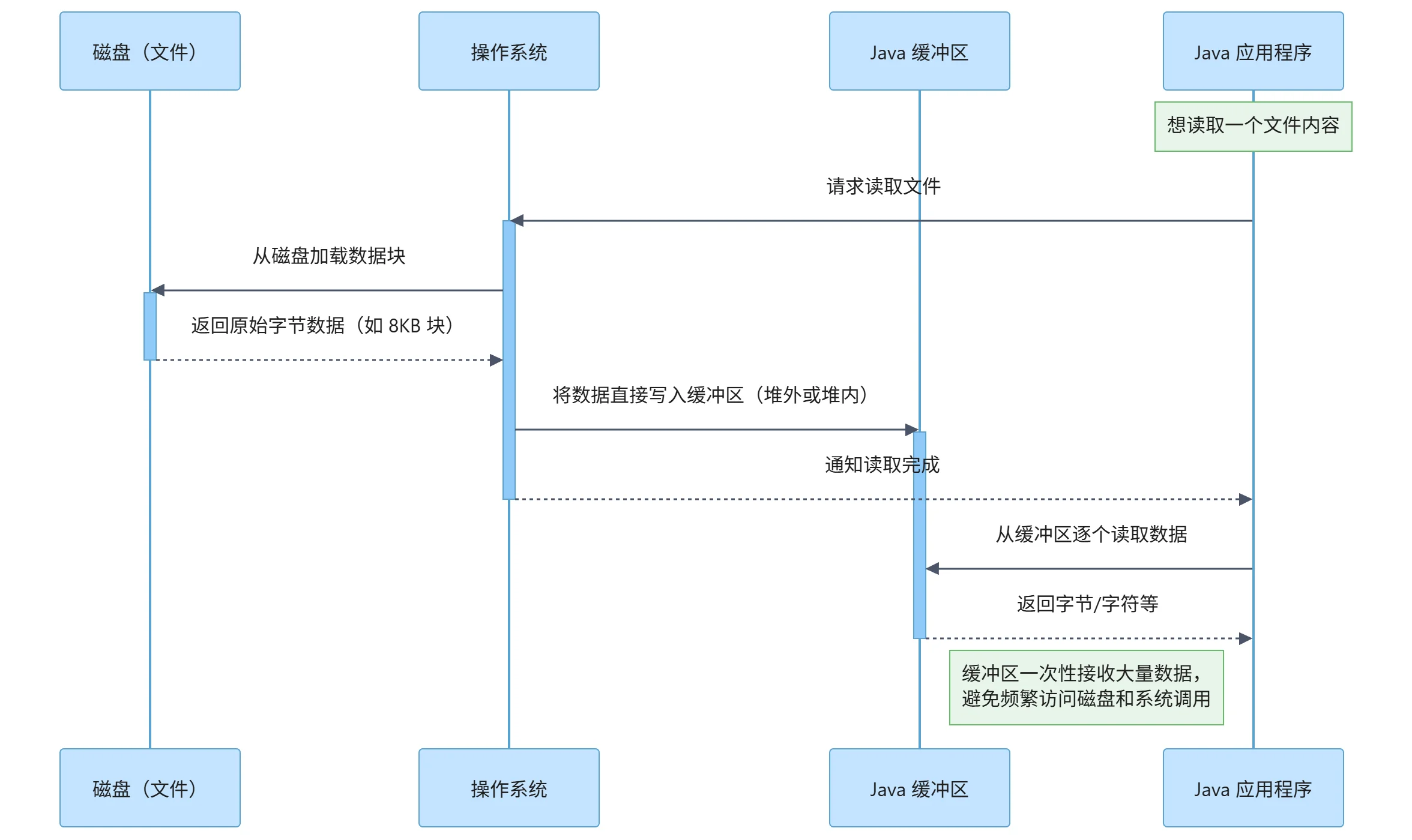 当我们直接使用 FileReader 或 FileInputStream 逐字节 / 逐字符读取文件时,每次读取都会触发一次系统调用。而系统调用开销较大,尤其在处理大文件时,性能会显著下降。