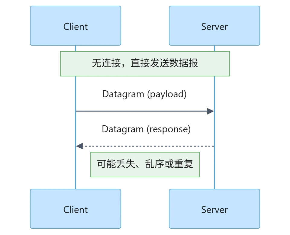 无连接:无需建立连接,直接发送数据报