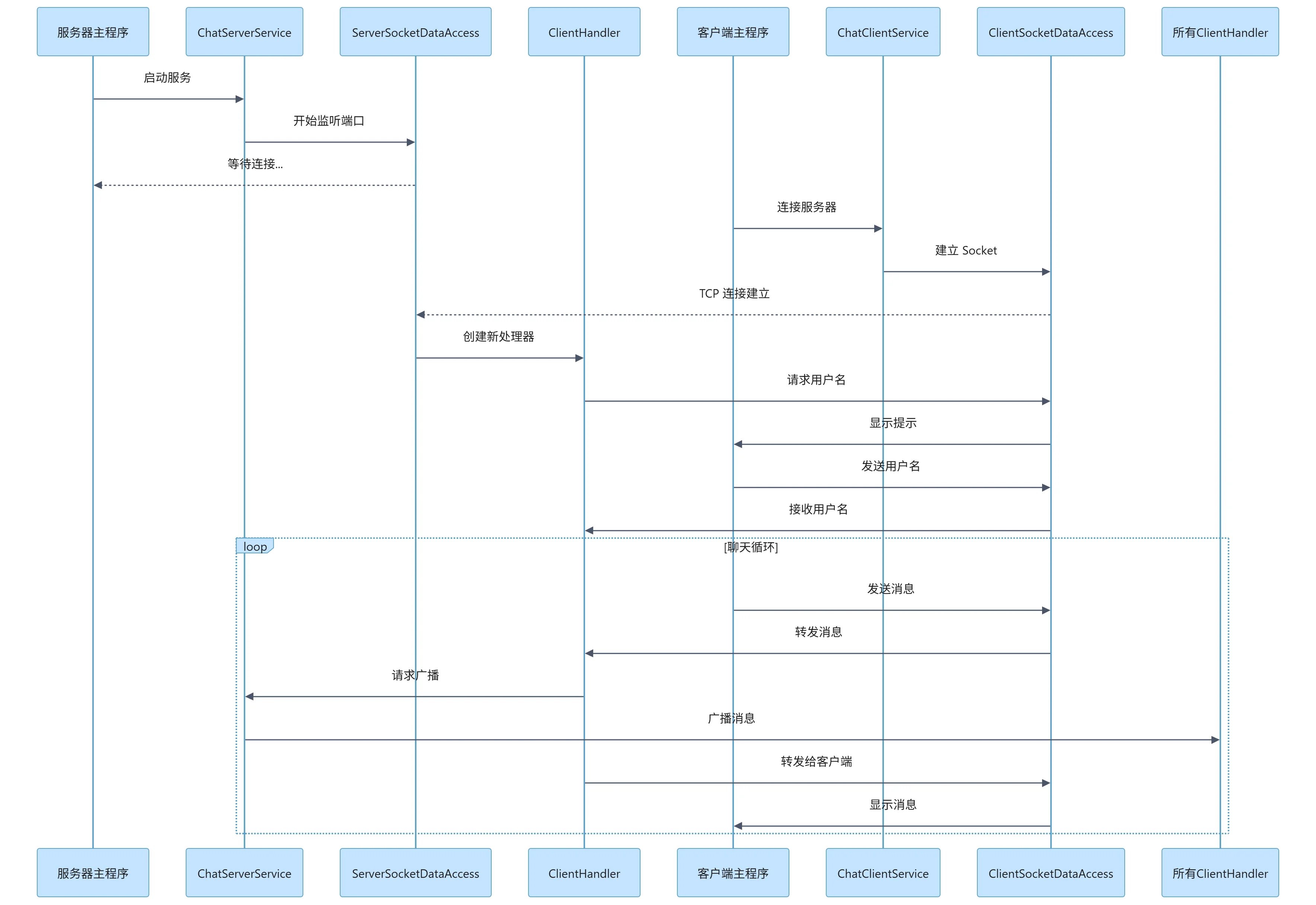 客户端程序:用户启动后连接服务器,输入用户名,随后可发送消息;同时实时接收并显示所有其他用户的消息。
