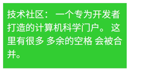 无论源代码中有多少个空格,渲染后只显示一个。文本在到达容器右边缘时会自动折行。