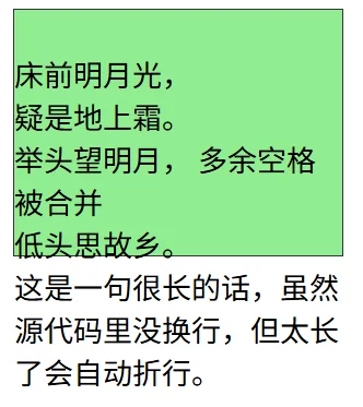 源代码中的回车换行生效,多个空格变成一个,长句子在容器边缘自动折行。