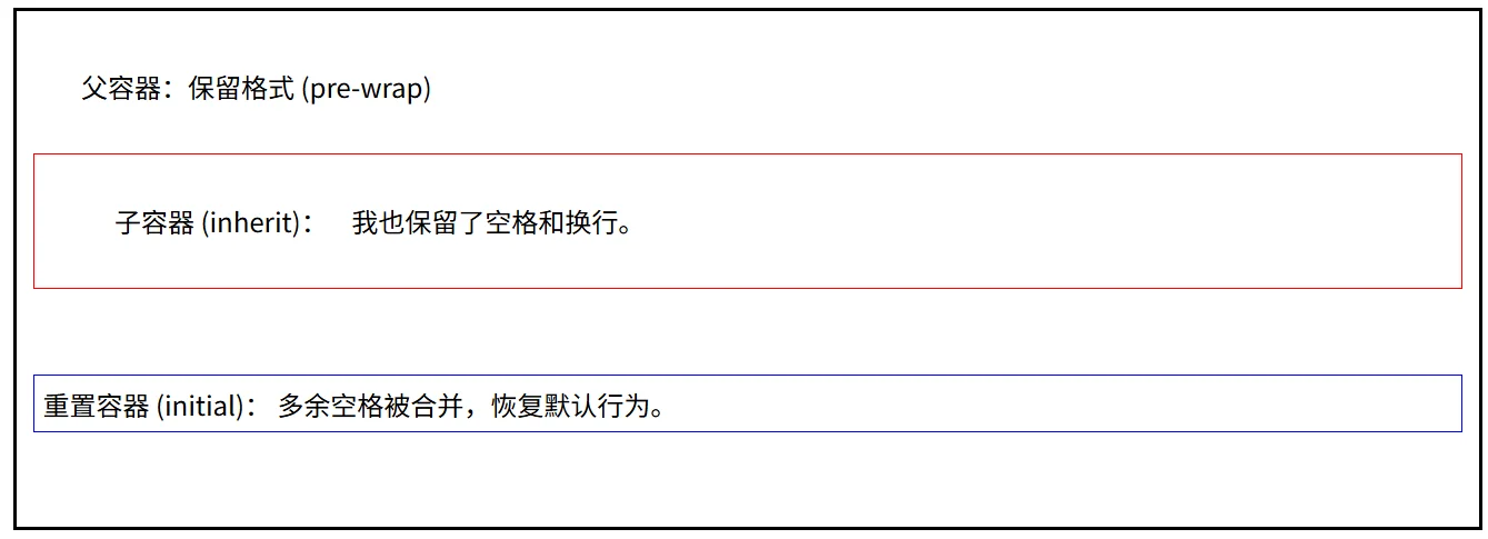 inherit:强制子元素继承父元素的 white-space 值。常用于确保组件内部行为一致。