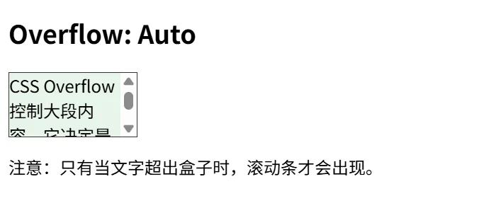 <p>注意:只有当文字超出盒子时,滚动条才会出现。</p>
