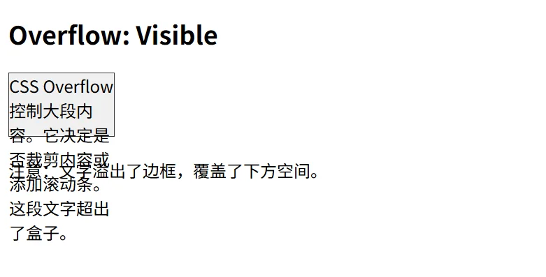 visible 是 overflow 的默认值。在此模式下,溢出内容不会被裁剪,而是直接渲染在元素盒子之外,可能会覆盖相邻的元素。