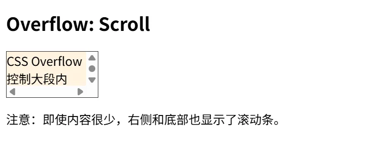 scroll 模式会裁剪溢出内容,但始终显示滚动条(即使内容没有溢出)。用户可以通过滚动条查看完整内容。