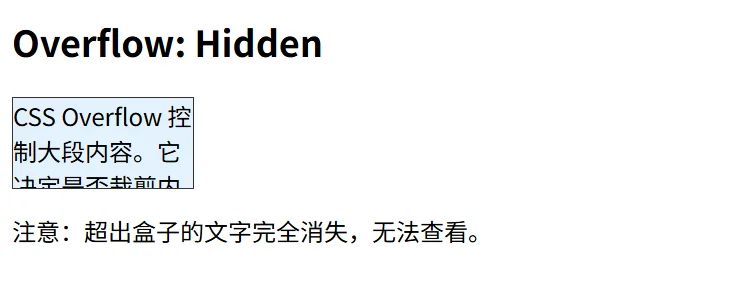 <p>注意:超出盒子的文字完全消失,无法查看。</p>