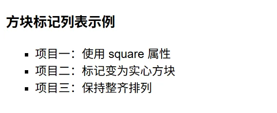 无序列表 (<ul>):默认使用实心圆点(disc)作为标记,适用于没有特定顺序的项目集合。