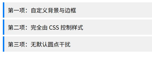 语义化优先:不要为了视觉效果而滥用 <div> 模拟列表。始终使用 <ul> 或 <ol> 标签,仅在 CSS 层面修改其外观,以保证无障碍访问(Accessibility)。