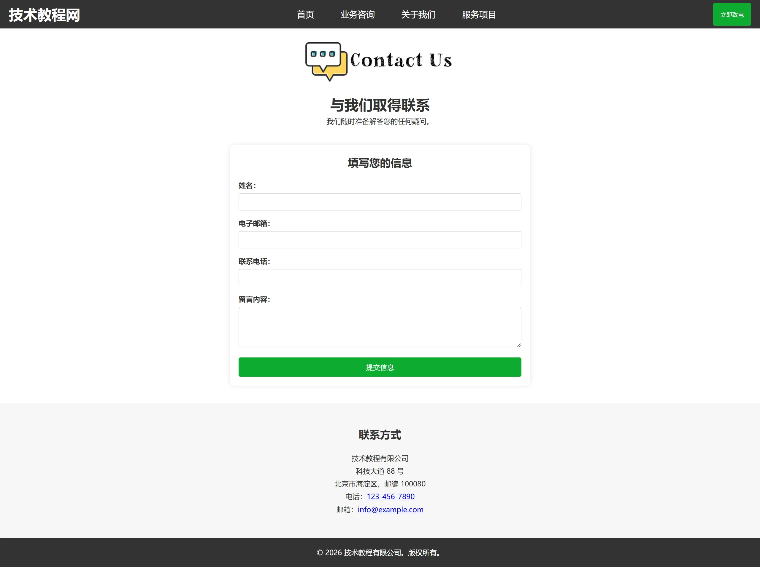 公司信息 (.contact-info):使用 <address> 标签语义化地展示公司联系方式。
