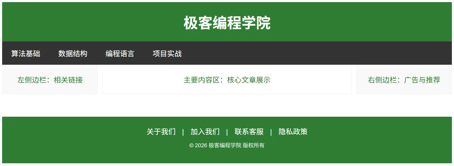 </html>内容区是网页的主体,承载核心信息。在传统的多栏布局中,内容区常被划分为左、中、右三列,分别用于放置侧边栏导航、主要文章和广告 / 推荐内容。