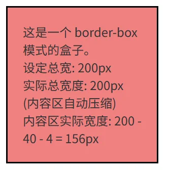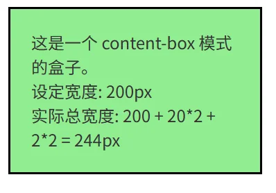 width: 200px,但盒子实际上占据了 244px 的空间。如果在固定宽度的容器中放置多个这样的盒子,很容易导致换行或溢出。