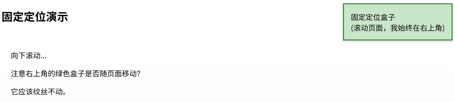 <div class="fixed-box">固定定位盒子<br>(滚动页面,我始终在右上角)</div>