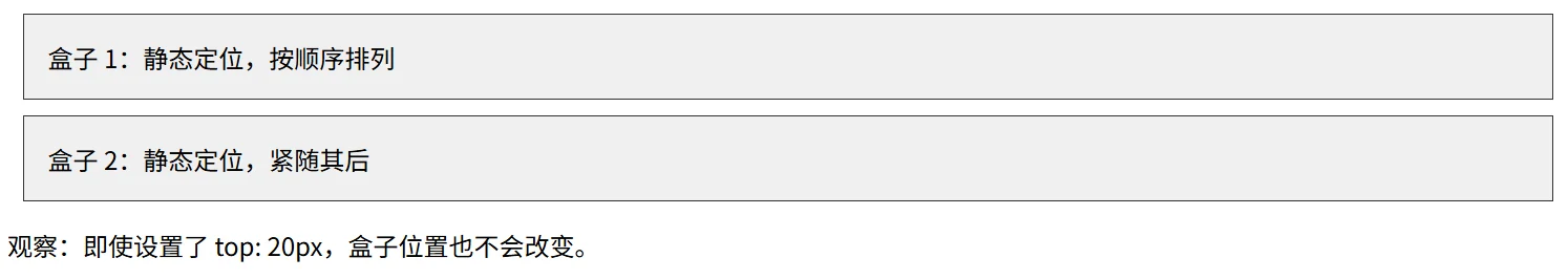 <p>观察:即使设置了 top: 20px,盒子位置也不会改变。</p>