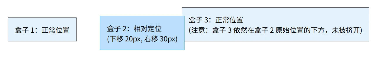 <div class="box relative-box">盒子 2:相对定位<br>(下移 20px, 右移 30px)</div>