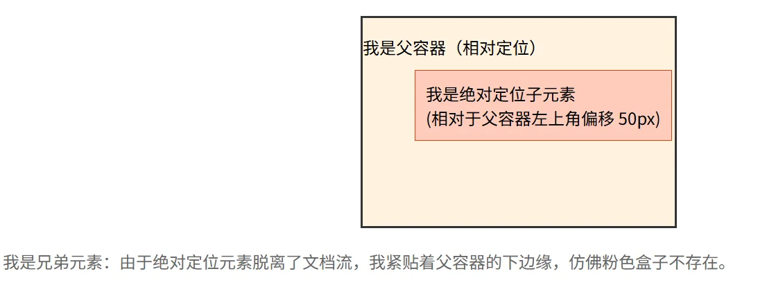 <div class="sibling">我是兄弟元素:由于绝对定位元素脱离了文档流,我紧贴着父容器的下边缘,仿佛粉色盒子不存在。</div>