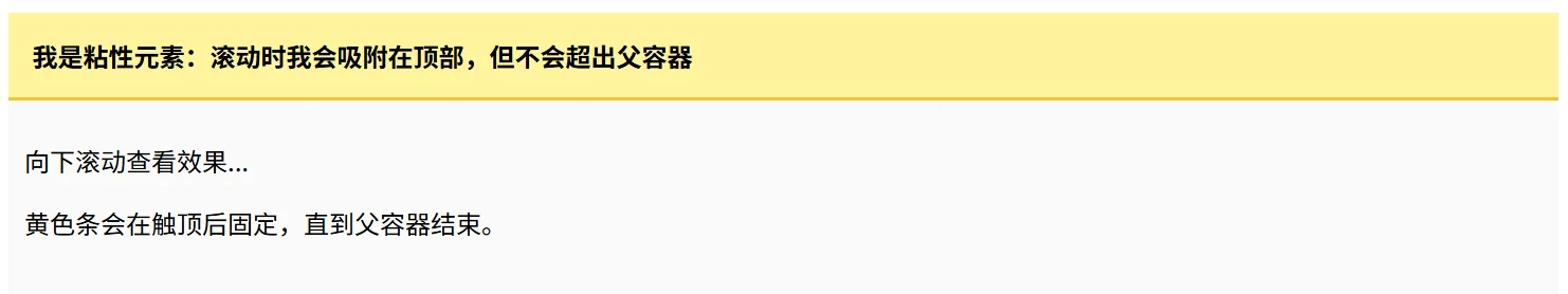 <div class="sticky-box">我是粘性元素:滚动时我会吸附在顶部,但不会超出父容器</div>