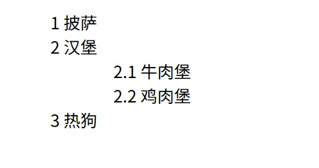 嵌套在第二个列表项下的子项显示为 "2.1"、"2.2"