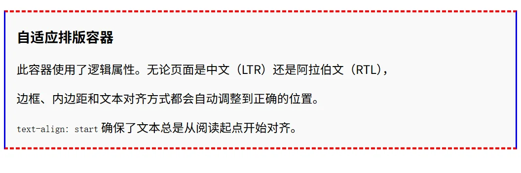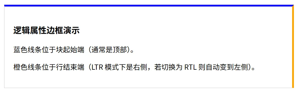 使用逻辑属性可以轻松创建适应不同书写模式的边框效果,无需为 RTL 语言单独写一套样式。