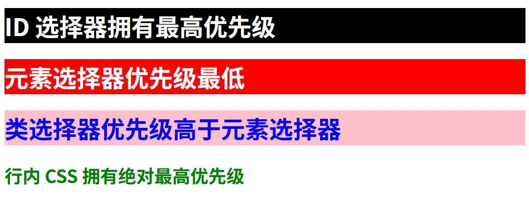 2. ID 优先级 > 类优先级 > 元素优先级。