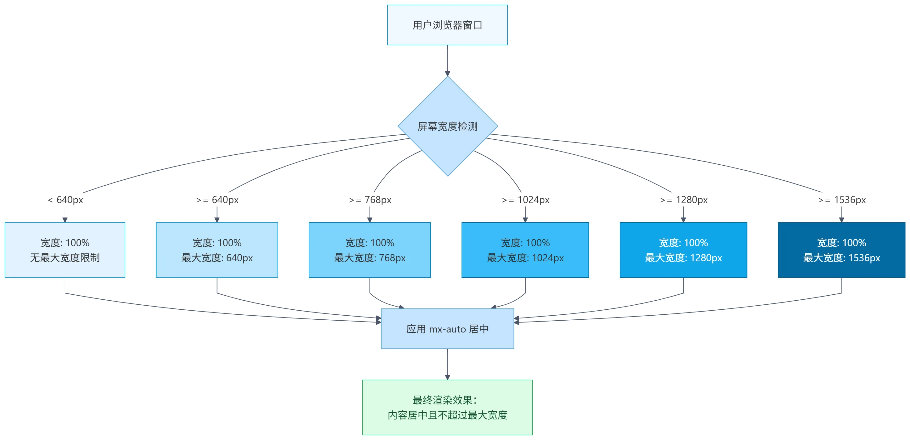 图示说明:随着屏幕变宽,容器的最大宽度限制逐步提升,但始终通过 mx-auto 保持水平居中状态,确保内容在任何设备上都不会过度拉伸。