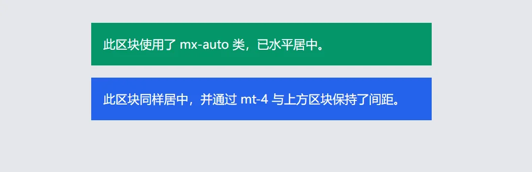 第二个 div 引入了 mt-4(上边距),展示了如何控制多个居中元素之间的垂直距离。