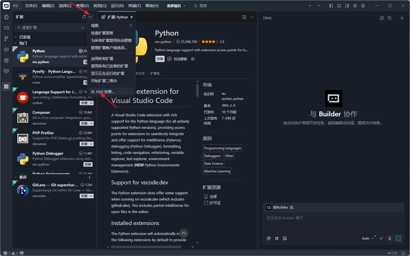 将下载的 .vsix 文件直接 拖拽 到插件市场面板中,TRAE 将自动识别并安装。