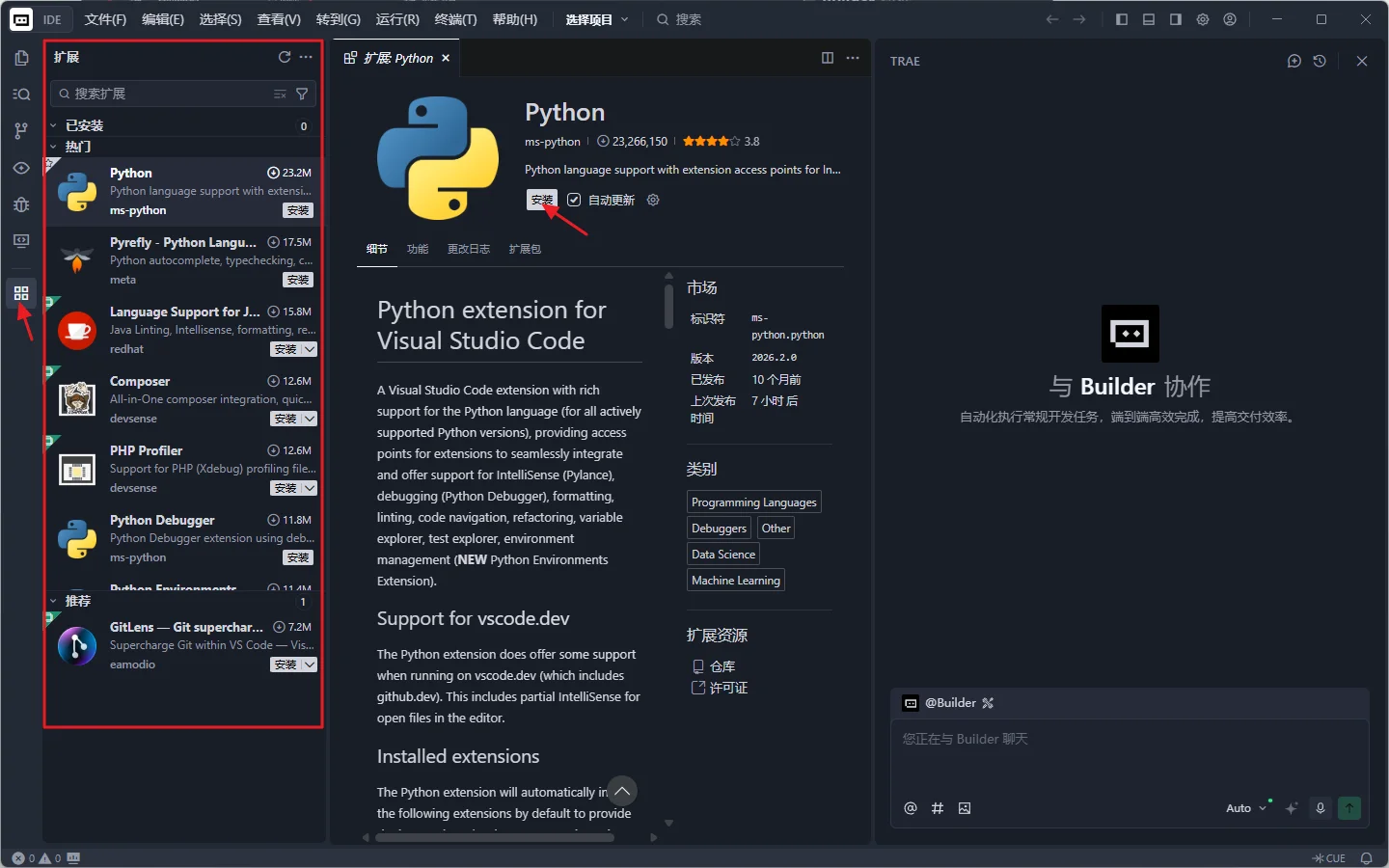 搜索插件:在顶部搜索框输入插件名称(例如 "Python", "Prettier")。