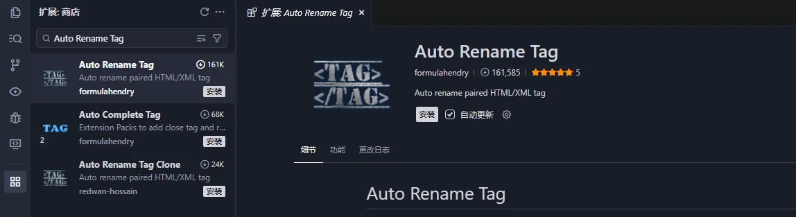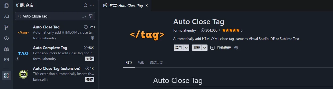 功能描述:当您在 HTML 或 XML 文件中输入开始标签(如 <div>)并按下 > 时,插件会自动补全对应的结束标签(</div>),并将光标置于两者之间。