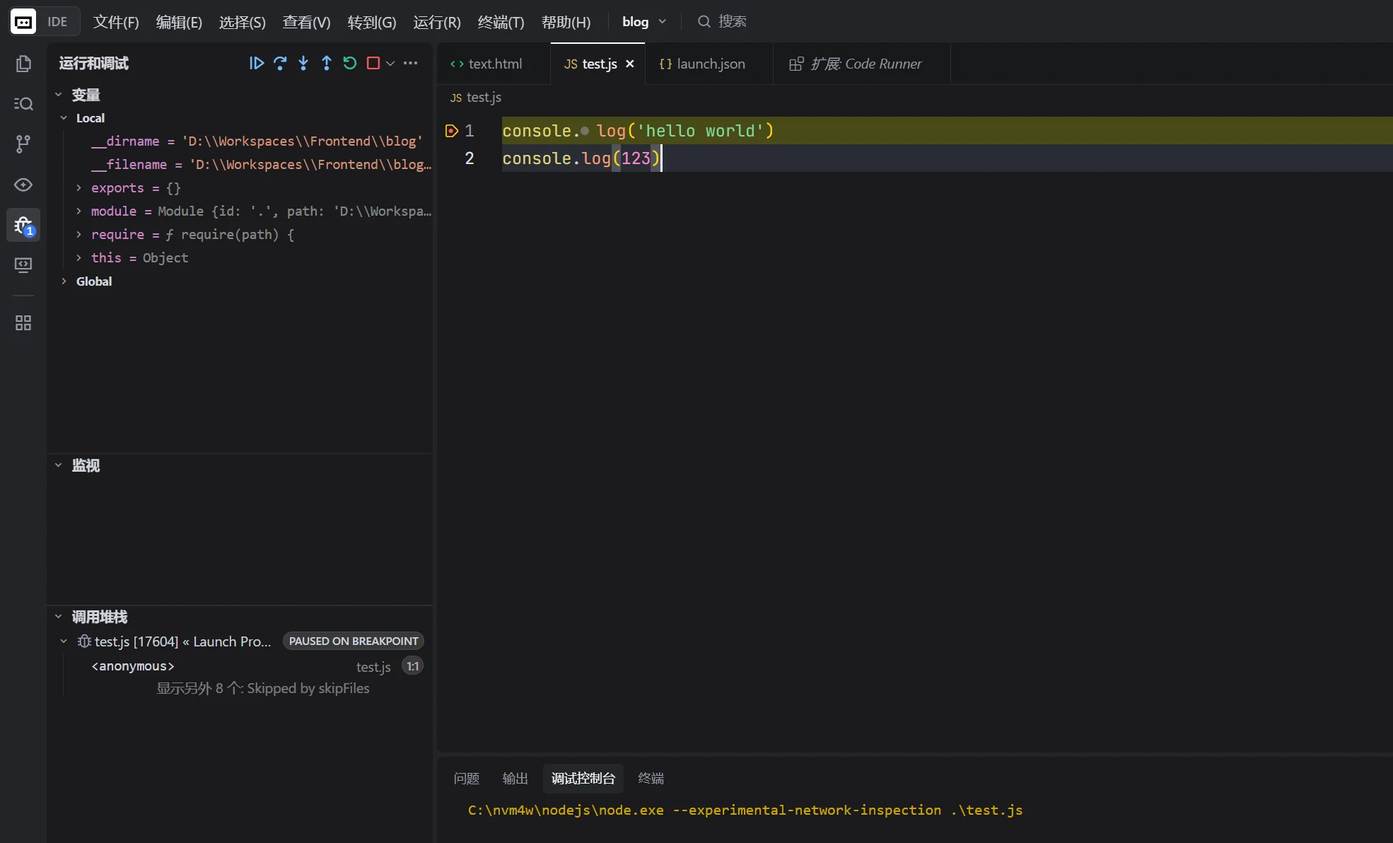 点击 “创建 launch.json 文件” → 选择 Node.js。生成的默认配置通常为: