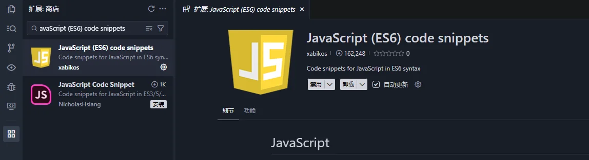功能描述:提供一套丰富的 ECMAScript 6+ 语法快捷代码片段。只需输入简短的前缀(Abbreviation),按下 Tab 键即可生成完整的代码块。