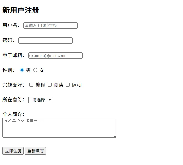 <textarea id="bio" name="bio" rows="4" cols="50" placeholder="请简单介绍你自己..."></textarea>