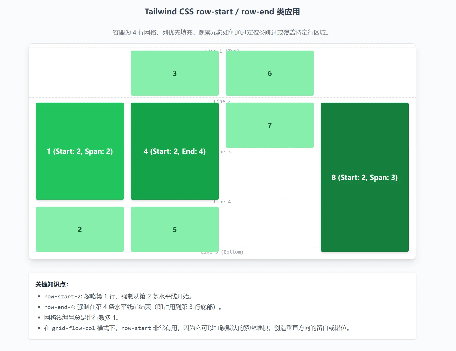 <li>在 <code>grid-flow-col</code> 模式下,<code>row-start</code> 非常有用,因为它可以打破默认的紧密堆积,创造垂直方向的留白或错位。</li>