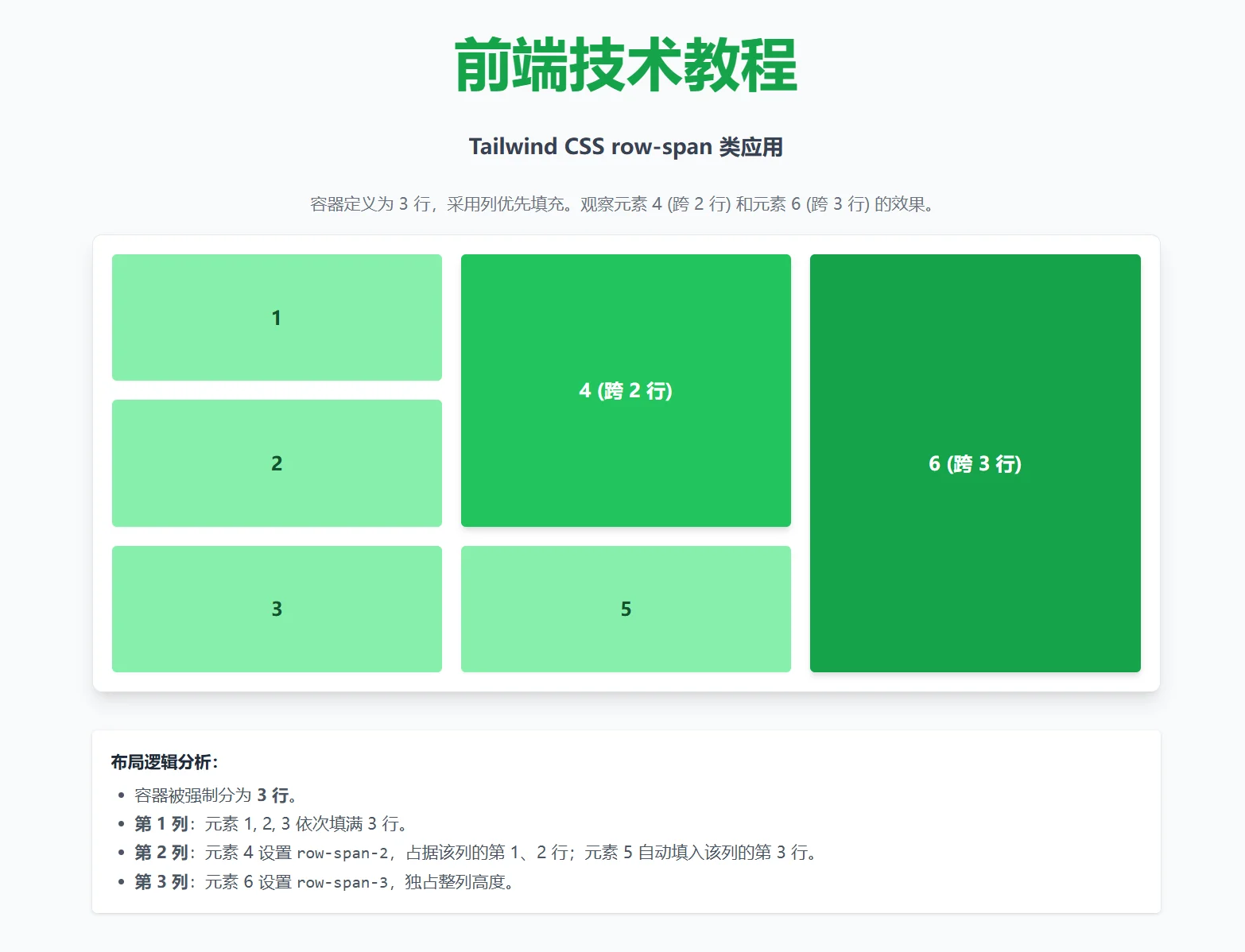 <li><strong>第 2 列</strong>:元素 4 设置 <code>row-span-2</code>,占据该列的第 1、2 行;元素 5 自动填入该列的第 3 行。</li>