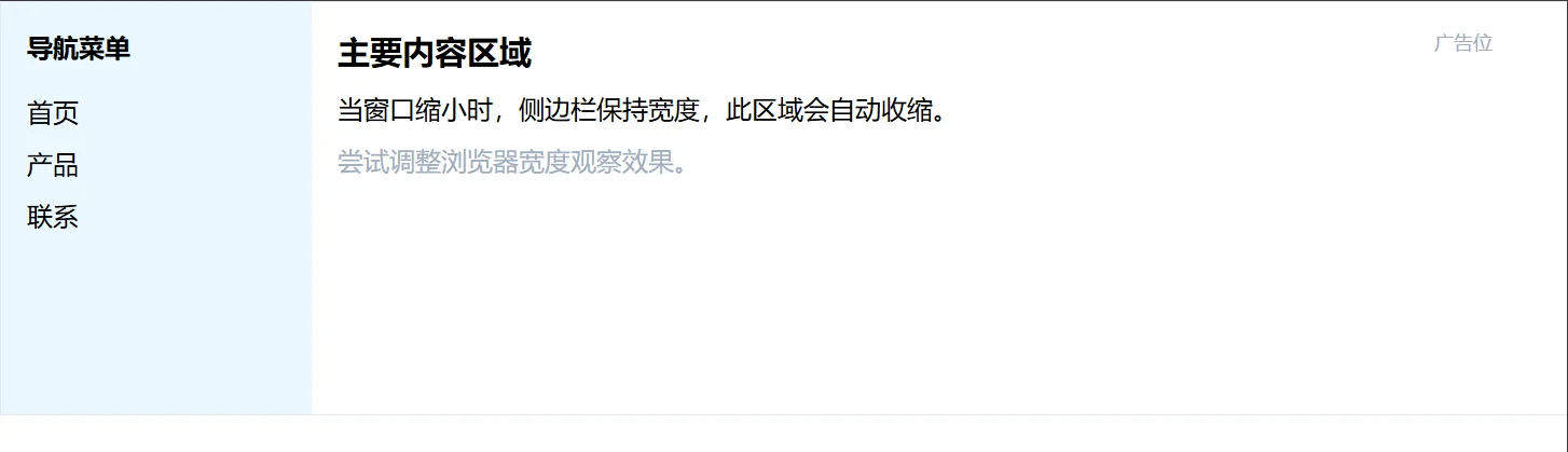 <p>当窗口缩小时,侧边栏保持宽度,此区域会自动收缩。</p>