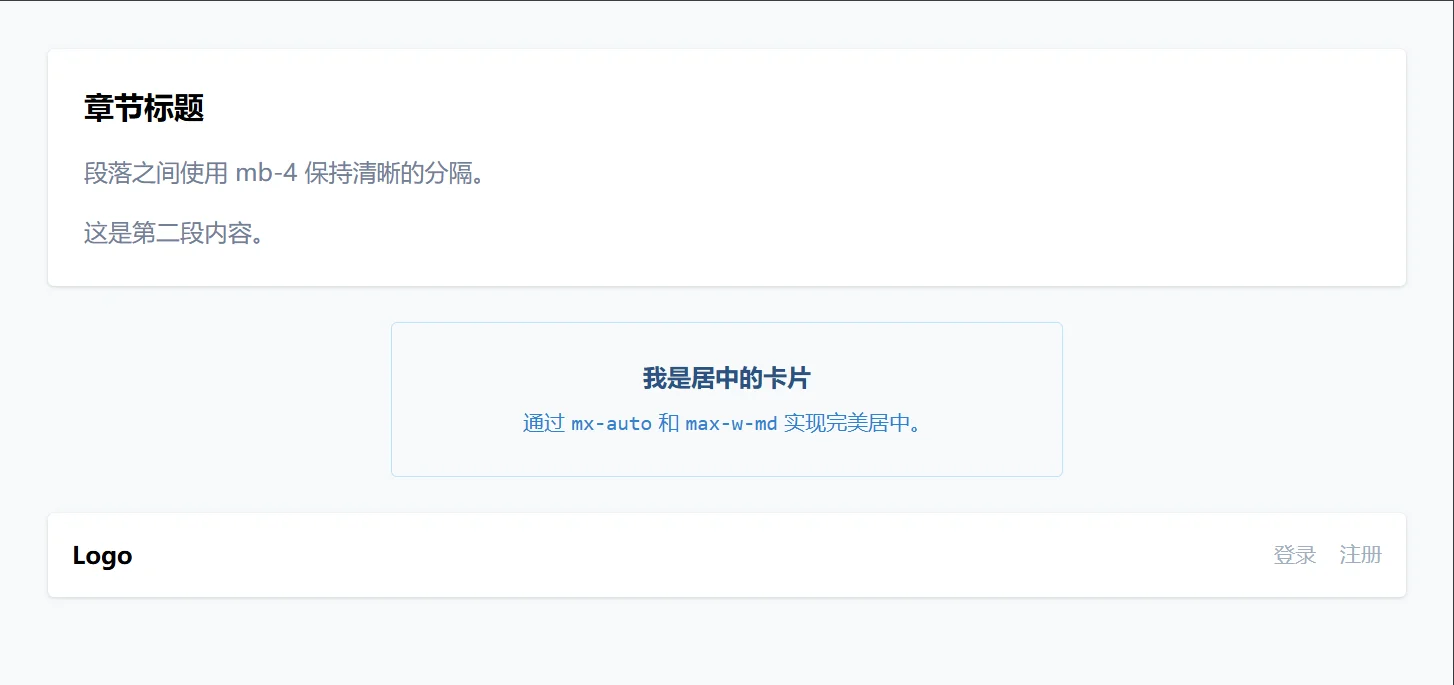 通过 <code>mx-auto</code> 和 <code>max-w-md</code> 实现完美居中。