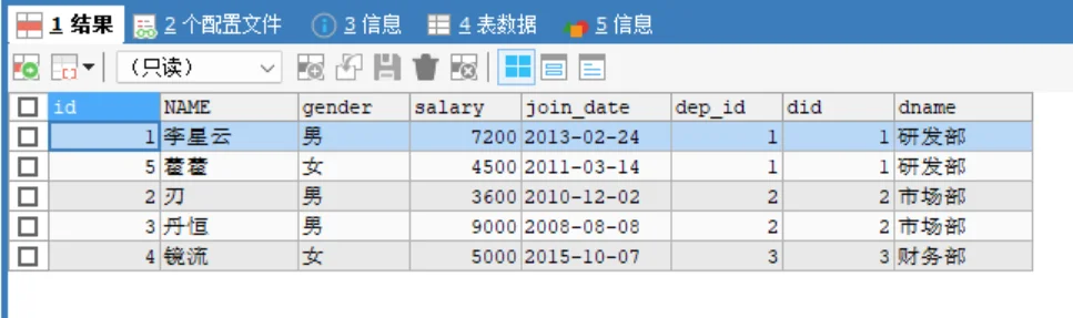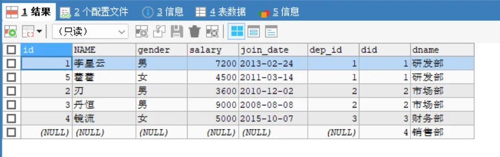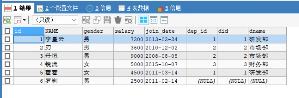 dep_id和did相等的行,得到正确的 5 条匹配记录(罗刹因 dep_id 为 NULL 被过滤)。